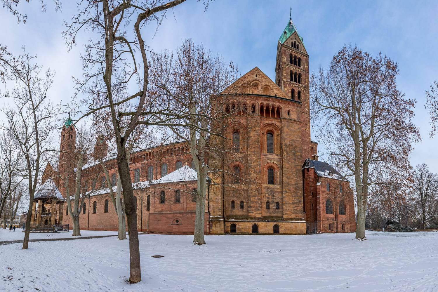 Der Speyerer Dom ist zu jeder Jahreszeit eine beeindruckende Sehenswürdigkeit. Doch wenn sich der Schnee über die Stadt legt und die Dächer und Bäume mit einer weißen Decke bedeckt, bekommt die Kathedrale eine besonders malerische Wirkung.